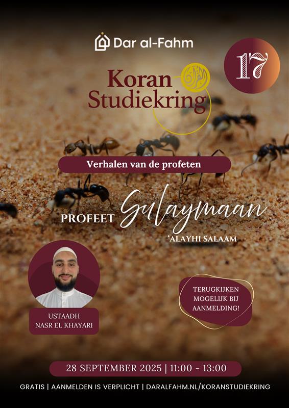 Tijdens deze Koranstudiekring verdiepen we ons in het levensverhaal van Profeet Sulaymaan (a.s.). Allah schonk hem naast wijsheid en kennis ook een ongeëvenaarde macht. Hij kon de taal van de dieren begrijpen, beschikte over controle over de wind en had gezag over de djinn.