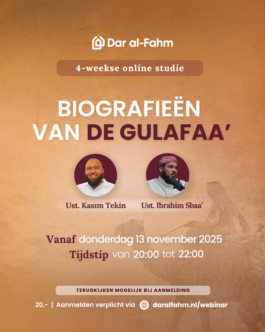 Volg de vierdelige webinarreeks met ust. Kasım Tekin en ust. Ibrahim Sbaa en laat je meenemen in de inspirerende biografieën van de Gulafaa’. Of je nu thuis bent of onderweg, je kunt online deelnemen, waar je ook bent. Terugkijken kan altijd!